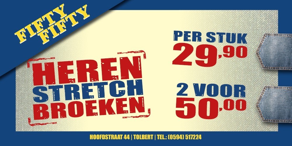 FiftyFifty wordt alweer drie jaar gerund door Jeroen Pol en zijn vriendin Elina de Jong. Zij namen de winkel over van Anne-Heerke en Corry Lourens. FiftyFifty Tolbert is al bijna dertig jaar een begrijp op het gebied van spijkerbroeken. FiftyFifty heeft een breed assortiment spijkerbroeken voor dames, heren en jeugd.